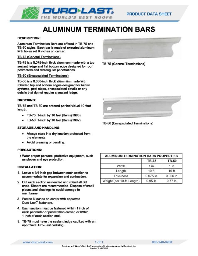 Do you prefer an aluminum termination bar versus our vinyl termination bar?   We now have 2 different types available!   TB-50 which is for terminations that do not require a sealant edge and TB-75 which has a sealant ledge for terminations that require a finished caulk joint.    Pricing is all in our updated price books…